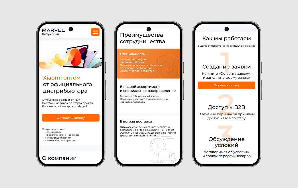 Официальный дистрибьютор Xiaomi в России запускал программу для корпоративных клиентов — поставку смартфонов, планшетов и аксессуаров для бизнеса. Нужна была посадочная страница, которая генерирует лиды через форму обратной связи.